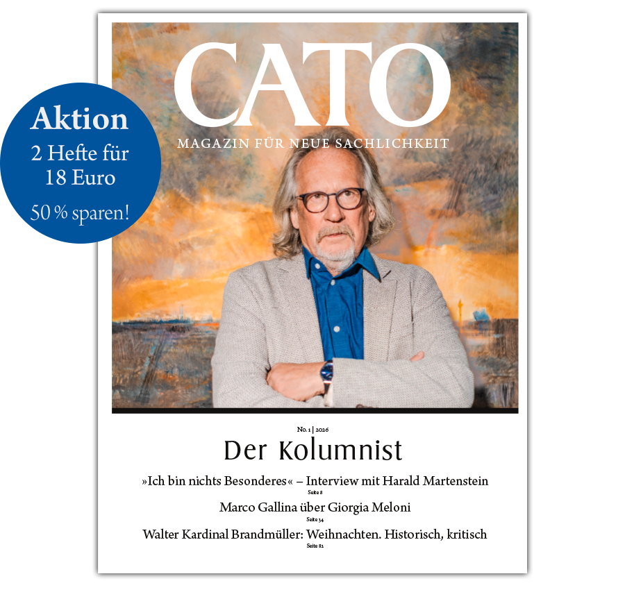 WerbekennzeichenUTM ContentUTM MediumUTM CampaignUTM SourceAktion | 2 Hefte für 18 EUR* Ich erhalte die aktuelle Ausgabe »Der Kolumnist«, die unter anderem ein Interview mit Harald Martenstein, enthält, sowie die kommende Februar-Ausgabe 2|2026 zum Kennenlernen. Zusammen für nur 18 Euro statt 36 Euro im Einzelkauf. Ich spare einmalig 50 Prozent. Wenn ich danach CATO weiter lesen möchte, brauche ich nichts Weiteres zu veranlassen. Ich erhalte CATO dann alle zwei Monate im Jahresabonnement von 98 Euro. Den Bezug kann ich jederzeit kündigen. RechnungsadresseE-Mail Adresse* Newsletter-Bestellung Ja, ich möchte gratis den CATO-Newsletter per E-Mail erhalten Ich bestelle als* Person Firma Organisation Firmenname*Organisationsname*Anrede*AnredeHerrFrauTitelName* Vorname Nachname Anschrift* Anschrift PLZ Ort LandAfghanistanAlbanienAlgerienAmerikanisch-SamoaAmerikanische JungferninselnAndorraAngolaAnguillaAntarktisAntigua und BarbudaArgentinienArmenienArubaAserbaidschanAustralienBahamasBahrainBangladeshBarbadosBelgienBelizeBeninBermudaBhutanBolivienBosnien und HerzegowinaBotswanaBouvetinselBrasilienBritische JungferninselnBritisches Territorium im Indischen OzeanBrunei DarussalamBulgarienBurkina FasoBurundiCayman IslandsChileChinaCookinselnCosta RicaCote D'IvoireCuraçaoDemokratische Volksrepublik LaosDeutschlandDjiboutiDominicaDominikanische RepublikDänemarkEcuadorEl SalvadorEritreaEstlandEswatiniFalklandinselnFidschiFinnlandFrankreichFranzösisch-GuayanaFranzösisch-PolynesienFranzösische Süd- und AntarktisgebieteFutuna (Wallis und Futuna)Färöer-InselnGabonGambiaGeorgienGhanaGibraltarGrenadaGriechenlandGroßbritannienGrönlandGuadeloupeGuamGuatemalaGuernseyGuineaGuinea-BissauGuyanaHaitiHeard und McDonaldinselnHeiliger StuhlHondurasHongkongIndienIndonesienIrakIranIrlandIslandIsle of ManIsraelItalienJamaikaJapanJemenJerseyJordanienKambodschaKamerunKanadaKap VerdeKaribische NiederlandeKasachstanKatarKeniaKirgistanKiribatiKokosinselnKolumbienKomorenKongoKongo, Demokratische Republik desKorea. Demokratische VolksrepublikKroatienKubaKuwaitLesothoLettlandLibanonLiberiaLiechtensteinLitauenLuxemburgLybienMacauMadagaskarMalawiMalaysiaMaledivenMaliMaltaMarokkoMarshall-InselnMartiniqueMauretanienMauritiusMayotteMexikoMikronesienMoldawienMonacoMongolaiMontenegroMontserratMosambikMyanmarNamibiaNauruNepalNeukaledonienNeuseelandNicaraguaNiederlandeNigerNigeriaNiueNordmazedonienNorfolkinselNorwegenNördliche MarianenOmanOsttimorPakistanPalauPanamaPapua Neu GuineaParaguayPeruPhilippinenPitcairninselnPolenPortugalPuerto RicoRuandaRumänienRussische FöderationRéunionSaint-BarthélemySaint-Pierre und MiquelonSalomonenSambiaSamoaSan MarinoSaudi-ArabienSchwedenSchweizSenegalSerbienSeychellenSierra LeoneSimbabweSingapurSint MaartenSlovenienSlowakeiSomaliaSpanienSri LankaSt. Helena, Ascension und Tristan da CunhaSt. Kitts und NevisSt. LuciaSt. MartinSt. Vincent und die GrenadinenStaat PalästinaSudanSurinamSvalbard und Jan MayenSyrien, Arabische RepublikSão Tomé und PríncipeSüdafrikaSüdgeorgien und die Südlichen SandwichinselnSüdkoreaSüdsudanTadschikistanTaiwanTansania, Vereinte RepublikThailandTogoTokelauTongaTrinidad und TobagoTschadTschechienTunesienTurkmenistanTurks- und CaicosinselnTuvaluTürkeiU.S.A.US Minor Outlying IslandsUgandaUkraineUngarnUruguayUsbekistanVanuatuVenezuelaVereinigte Arabische EmirateVietnamWeihnachtsinselWeißrusslandWestsaharaZentralafrikanische RepublikZypernÄgyptenÄquatorial GuineaÄthopienÅlandinselnÖsterreich Land Abweichende Lieferadresse Abweichende Lieferadresse Anrede*AnredeHerrFrauTitelName* Vorname Nachname Anschrift* Anschrift PLZ Ort LandAfghanistanAlbanienAlgerienAmerikanisch-SamoaAmerikanische JungferninselnAndorraAngolaAnguillaAntarktisAntigua und BarbudaArgentinienArmenienArubaAserbaidschanAustralienBahamasBahrainBangladeshBarbadosBelgienBelizeBeninBermudaBhutanBolivienBosnien und HerzegowinaBotswanaBouvetinselBrasilienBritische JungferninselnBritisches Territorium im Indischen OzeanBrunei DarussalamBulgarienBurkina FasoBurundiCayman IslandsChileChinaCookinselnCosta RicaCote D'IvoireCuraçaoDemokratische Volksrepublik LaosDeutschlandDjiboutiDominicaDominikanische RepublikDänemarkEcuadorEl SalvadorEritreaEstlandEswatiniFalklandinselnFidschiFinnlandFrankreichFranzösisch-GuayanaFranzösisch-PolynesienFranzösische Süd- und AntarktisgebieteFutuna (Wallis und Futuna)Färöer-InselnGabonGambiaGeorgienGhanaGibraltarGrenadaGriechenlandGroßbritannienGrönlandGuadeloupeGuamGuatemalaGuernseyGuineaGuinea-BissauGuyanaHaitiHeard und McDonaldinselnHeiliger StuhlHondurasHongkongIndienIndonesienIrakIranIrlandIslandIsle of ManIsraelItalienJamaikaJapanJemenJerseyJordanienKambodschaKamerunKanadaKap VerdeKaribische NiederlandeKasachstanKatarKeniaKirgistanKiribatiKokosinselnKolumbienKomorenKongoKongo, Demokratische Republik desKorea. Demokratische VolksrepublikKroatienKubaKuwaitLesothoLettlandLibanonLiberiaLiechtensteinLitauenLuxemburgLybienMacauMadagaskarMalawiMalaysiaMaledivenMaliMaltaMarokkoMarshall-InselnMartiniqueMauretanienMauritiusMayotteMexikoMikronesienMoldawienMonacoMongolaiMontenegroMontserratMosambikMyanmarNamibiaNauruNepalNeukaledonienNeuseelandNicaraguaNiederlandeNigerNigeriaNiueNordmazedonienNorfolkinselNorwegenNördliche MarianenOmanOsttimorPakistanPalauPanamaPapua Neu GuineaParaguayPeruPhilippinenPitcairninselnPolenPortugalPuerto RicoRuandaRumänienRussische FöderationRéunionSaint-BarthélemySaint-Pierre und MiquelonSalomonenSambiaSamoaSan MarinoSaudi-ArabienSchwedenSchweizSenegalSerbienSeychellenSierra LeoneSimbabweSingapurSint MaartenSlovenienSlowakeiSomaliaSpanienSri LankaSt. Helena, Ascension und Tristan da CunhaSt. Kitts und NevisSt. LuciaSt. MartinSt. Vincent und die GrenadinenStaat PalästinaSudanSurinamSvalbard und Jan MayenSyrien, Arabische RepublikSão Tomé und PríncipeSüdafrikaSüdgeorgien und die Südlichen SandwichinselnSüdkoreaSüdsudanTadschikistanTaiwanTansania, Vereinte RepublikThailandTogoTokelauTongaTrinidad und TobagoTschadTs